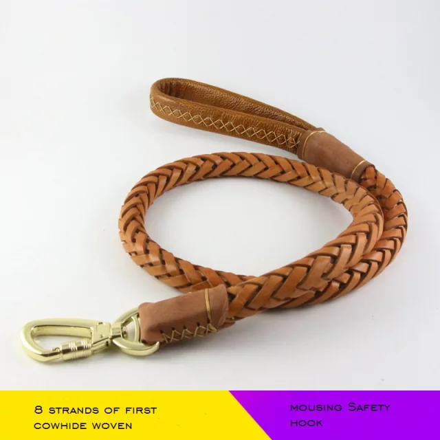 The leash is knitted with 8 strands of leather and it is 2.5cm in diameter.The length is about 110cm. It is suitable for medium and large breed dogs.