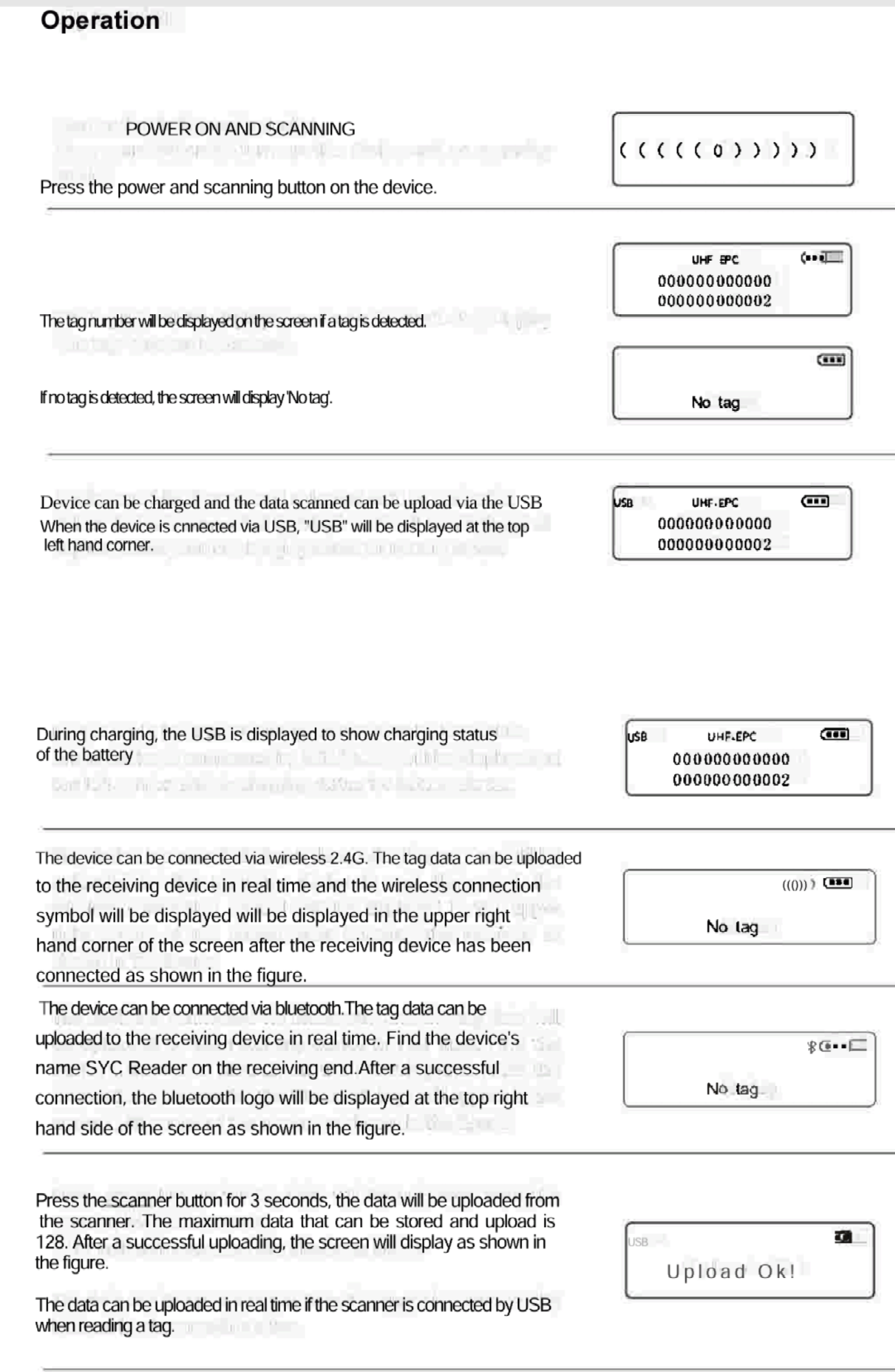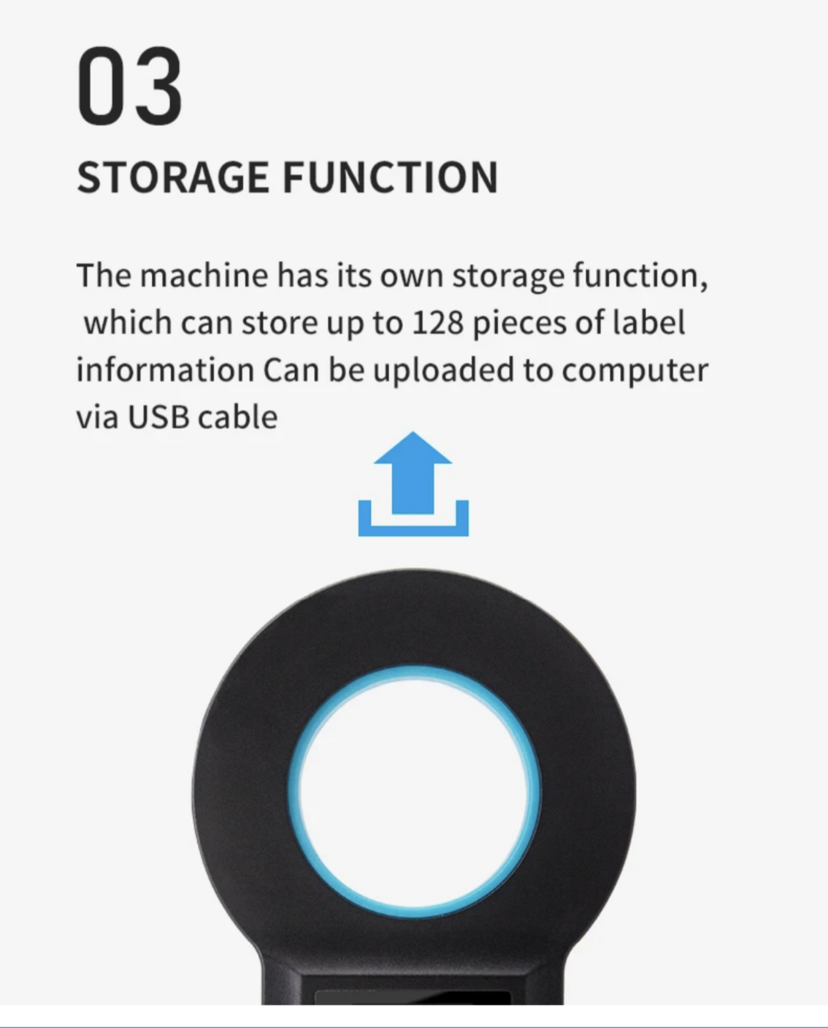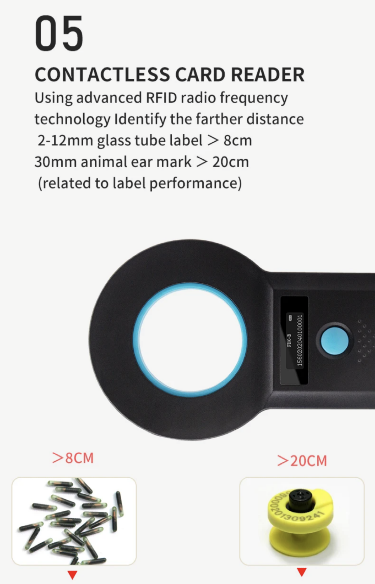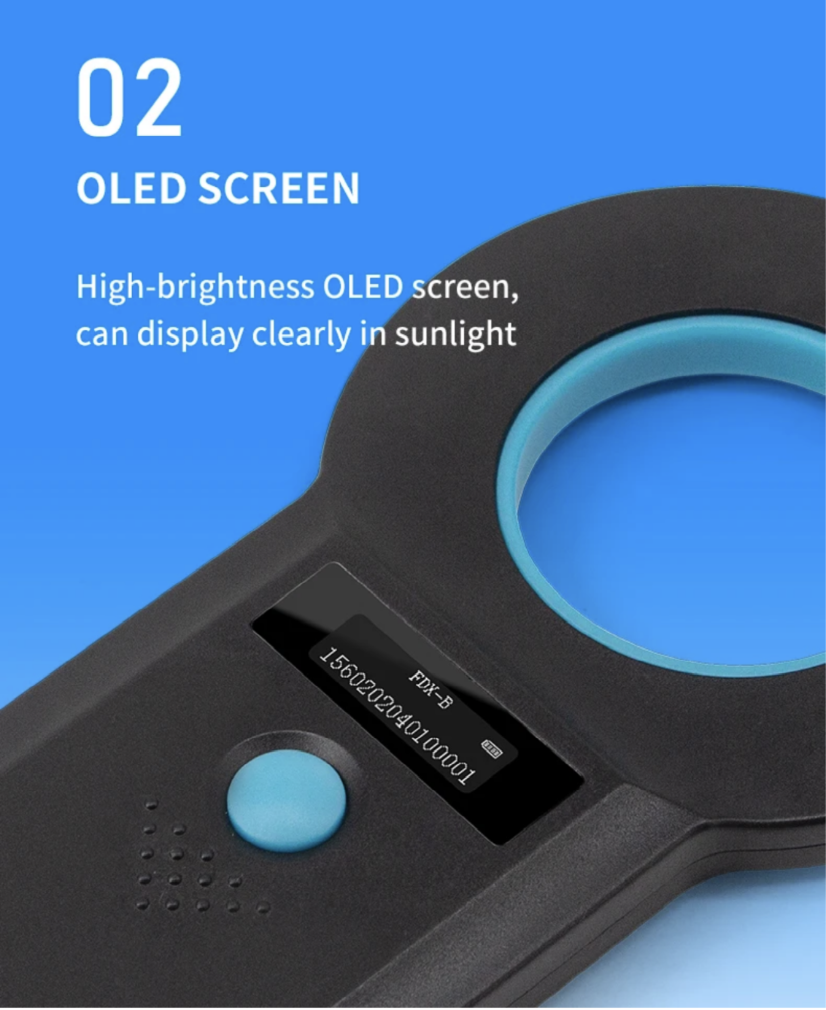 The illumination is made of high-brightness OLED display. Suffice to say it can display clearly even under strong light conditions, indoors or outdoors. It stores up to 128 pieces of tag information, which can be uploaded to a computer via the USB data cable. The data cable also serves as the charging cable.